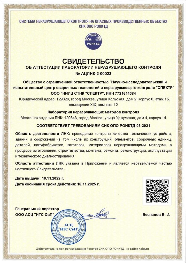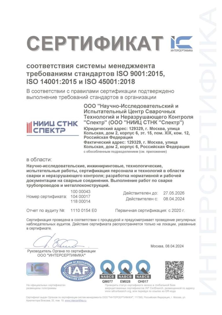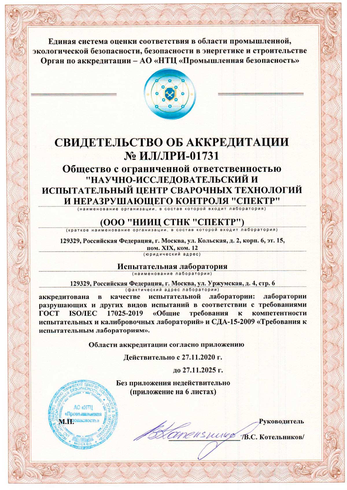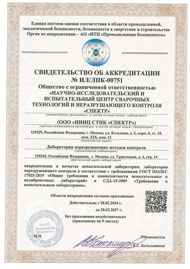 Аккредитационные документы и сертификаты Научно-Исследовательского и Испытательного Центра Сварочных Технологий и Неразрушающего Контроля «Спектр»