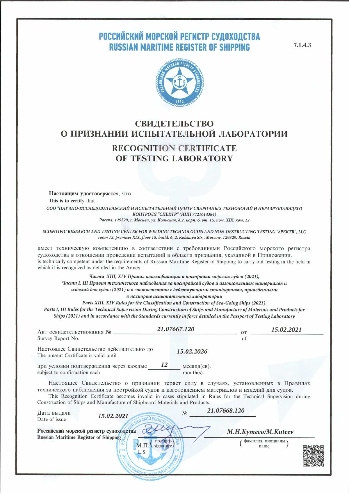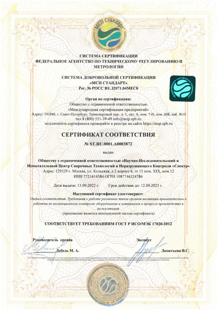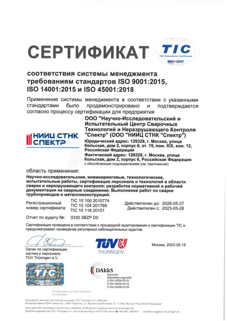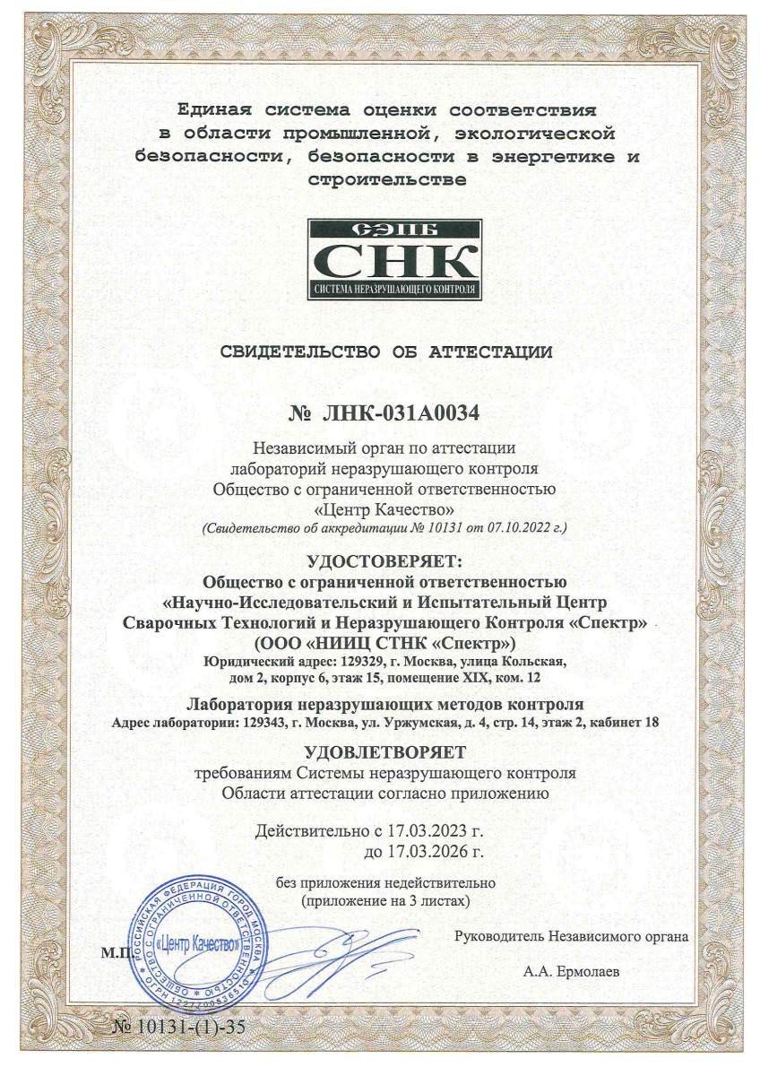 Аккредитационные документы и сертификаты Научно-Исследовательского и Испытательного Центра Сварочных Технологий и Неразрушающего Контроля «Спектр»
